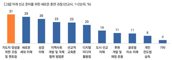 - ¹Ì·¡ ¼±±³ ÈÆ·Ã, ¡®¸®´õ½Ê∙»õ·Î¿î ¼¼´ë ÀÌÇØ¡¯°¡ ÇÙ½É °úÁ¦! ¡Ü ¼±±³»çµé¿¡°Ô ¹Ì·¡ ¼±±³ Áغñ¸¦ À§ÇØ Æ÷ÇÔÇØ¾ß ÇÒ »õ·Î¿î ÈÆ·Ã °úÁ¤ÀÌ ¹«¾ùÀÎÁö ¹°¾ú´Ù. °¡Àå ¸¹ÀÌ ¼±ÅÃµÈ Ç׸ñÀº ¡®ÁöµµÀÚ ¾ç¼ºÀ» À§ÇÑ ÄÚĪ ¹× ¸àÅ丵¡¯(31%)À̾ú´Ù. ÀÌ´Â ¼±±³Àû ¸®´õ·Î¼ ¸®´õ½Ê ±³À°ÀÇ Çʿ伺ÀÌ ³ô¾ÆÁüÀ» ½Ã»çÇÑ´Ù. ¡Ü ÀÌ¾î ¡®»õ·Î¿î ¼¼´ë ÀÌÇØ¡¯ 29%, ¡®¼º°æ ÀÌÇØ¡¯ 26%, ¡®Áö¿ª»çȸ °³¹ß ¹× ±¹Á¦ Çù·Â ¹æ¹ý·Ð¡¯ 23% µîÀÌ µÚ¸¦ À̾ú´Ù.