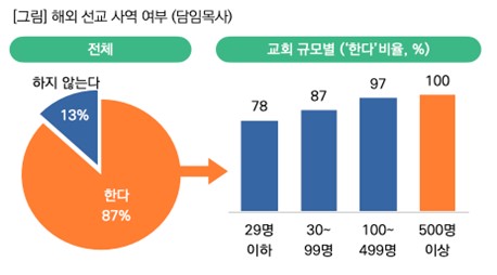 - ¼ÒÇü±³È¸µµ ´ëºÎºÐÀÌ ÇØ¿Ü ¼±±³»ç¿ª Âü¿©! ¡Ü Àüü ±³È¸ÀÇ 87%´Â ¼±±³»ç ÆÄ¼Û ȤÀº ÈÄ¿øÀ» Æ÷ÇÔÇÑ ÇØ¿Ü ¼±±³»ç¿ª¿¡ Âü¿©Çϰí ÀÖ´Â °ÍÀ¸·Î ³ªÅ¸³µ´Ù. ¡Ü ±³È¸ ±Ô¸ðº° »ìÆìº¸¸é, 100¸í ÀÌ»ó ±³È¸´Â ´ë´Ù¼ö(97~100%)°¡ ÇØ¿Ü¼±±³¿¡ Âü¿©Çϰí ÀÖ¾úÀ¸¸ç, ¡®29¸í ÀÌÇÏ¡¯ ¼ÒÇü±³È¸µµ »ç¿ª Âü¿©À²ÀÌ 78%·Î ±³È¸ ±Ô¸ð¿Í ¹«°üÇÏ°Ô ¼±±³»ç¿ª Âü¿©°¡ Ȱ¹ßÈ÷ ÀÌ·ïÁö°í ÀÖ¾ú´Ù.