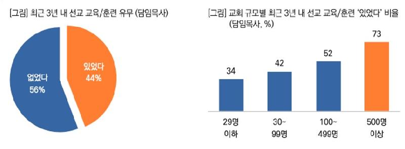 - ¸ñȸÀÚ 44%, ÃÖ±Ù 3³â ³» ¼±±³ ±³À°∙ÈÆ·Ã ½Ç½Ã! ¡Ü ¸ñȸÀÚ(´ãÀÓ¸ñ»ç)¸¦ ´ë»óÀ¸·Î ÃÖ±Ù 3³â ³» ¼±±³ ±³À°/ÈÆ·ÃÀ» ½Ç½ÃÇß´ÂÁö¸¦ ¹°Àº °á°ú, ¡®ÀÖ¾ú´Ù¡¯ 44%, ¡®¾ø¾ú´Ù¡¯ 56%·Î ³ªÅ¸³µ´Ù. ¡Ü ±³È¸ ±Ô¸ðº°·Î´Â ±Ô¸ð°¡ Ŭ¼ö·Ï ¼±±³ ±³À° °æÇè·üÀÌ ³ô¾ÆÁö´Â °æÇâÀ» º¸¿´´Ù. 500¸í ÀÌ»ó ±³È¸ÀÇ 73%°¡ ±³À°À» ½Ç½ÃÇÑ ¹Ý¸é, 29¸í ÀÌÇÏ ±³È¸´Â 34%¿¡ ºÒ°úÇØ, ¼ÒÇü±³È¸ÀÇ ¼±±³ ÈÆ·Ã Á¢±Ù¼ºÀÌ »ó´ëÀûÀ¸·Î ³·Àº Çö½ÇÀ» ¹Ý¿µÇÑ´Ù.