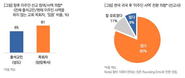 - ÇØ¿Ü ¼±±³»ç, ¡®Çѱ¹ ±Í±¹ ÈÄ ÀÌÁֹμ±±³·Î ÀüȯÇϰڴ١¯ 82%! ¡Ü ÇâÈÄ ÀÌÁֹμ±±³¿¡ Âü¿©Çϰųª(¼ºµµ ´ë»ó), »ç¿ªÇÒ ÀÇÇâÀÌ ÀÖ´ÂÁö(ÇöÀç ÀÌÁֹΠ»ç¿ªÇÏÁö ¾Ê´Â ±³È¸ ¸ñȸÀÚ ´ë»ó)¸¦ ¹°Àº °á°ú, ¼ºµµ 65%, ¸ñȸÀÚ(´ãÀÓ¸ñ»ç) 81%°¡ ¡®ÀÖ´Ù¡¯°í ÀÀ´äÇß´Ù. ¸ñȸÀÚµéÀÇ ´ëºÎºÐÀÌ ÀÌÁֹΠ»ç¿ª ÀÇÇâ·üÀÌ ¸Å¿ì ³ôÀ½À» ¾Ë ¼ö ÀÖ´Ù. ¡Ü À̹ø¿¡´Â ¼±±³»çµé¿¡°Ô Çѱ¹ ±Í±¹ ÈÄ ÀÌÁֹΠ»ç¿ªÀ¸·ÎÀÇ Àüȯ ÀÇÇâÀ» ¹°Àº °á°ú, ´ëºÎºÐÀÇ ¼±±³»ç(82%)°¡ ¡®ÀÇÇâÀÌ ÀÖ´Ù¡¯°í ÀÀ´äÇØ, ÇâÈÄ ±¹³» ÀÌÁֹμ±±³¿¡¼ ¼±±³»çµéÀÌ ±àÁ¤Àû ¿ªÇÒÀ» ¼öÇàÇÒ ¼ö ÀÖ´Â °¡´É¼ºÀ» È®ÀÎÇÒ ¼ö ÀÖ¾ú´Ù.