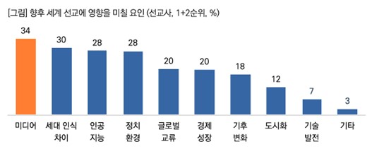 - ¹Ì·¡ ¼±±³ Ű¿öµå, ¡®¹Ìµð¾î∙AI¡¯! ¡Ü ¼±±³»çµé¿¡°Ô ÇâÈÄ 10³â°£ ¼¼°è¼±±³¿¡ ¿µÇâÀ» ¹ÌÄ¥ ¿äÀο¡ ´ëÇØ Áú¹®ÇÑ °á°ú(1+2¼øÀ§), ¡®¹Ìµð¾î¡¯(34%)°¡ °¡Àå ³ô°Ô ²ÅÇû´Ù. ´ÙÀ½À¸·Î ¡®¼¼´ë ÀÎ½Ä Â÷ÀÌ¡¯ 30%, ¡®ÀΰøÁö´É¡¯ 28%, ¡®Á¤Ä¡ ȯ°æ¡¯ 28% µîÀÌ ºñ½ÁÇÏ°Ô ³ô¾Ò´Ù. ÀÌ´Â µðÁöÅРȯ°æÀÇ º¯È¿Í ¼¼´ë °£ ¹®È °ÝÂ÷°¡ ¼±±³ÀÇ ÇÙ½É º¯¼ö°¡ µÉ ¼ö ÀÖÀ½À» º¸¿©ÁØ´Ù. ¡Ü ƯÈ÷ ¹Ìµð¾î¿Í ÀΰøÁö´É(AI)À» Ȱ¿ëÇÑ ¼±±³ÀÇ ½Ã´ë°¡ º»°ÝÈÇϰí ÀÖÀ½À» ½Ã»çÇÑ´Ù°í ÇØ¼®ÇÒ ¼ö ÀÖ´Ù.