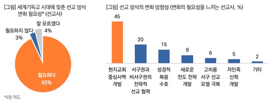 - ÇâÈÄ ¼±±³ ¹æ½Ä, ¡®ÇöÁö ±³È¸ Á᫐ »ç¿ª °³¹ß¡¯·ÎÀÇ Àüȯ ÇÊ¿ä! ¡Ü ±âµ¶±³°¡ ´õ ÀÌ»ó ¼±¸ Áß½ÉÀÇ Á¾±³°¡ ¾Æ´Ñ, ´Ù¾çÇÑ ¹®È¿Í Áö¿ª¿¡¼ ÀÚ»ýÀûÀ¸·Î ÀÚ¸® ÀâÀº ¡®¼¼°è±âµ¶±³(World Christianity)¡¯ ½Ã´ë¿¡ Á¢¾îµç °¡¿îµ¥, ¼±±³»çµé¿¡°Ô ÀÌ¿¡ ¸Â´Â ¼±±³ ¹æ½ÄÀÇ º¯È Çʿ伺À» ¹°¾ú´Ù. ¡Ü ±× °á°ú, ¼±±³»çÀÇ ´ë´Ù¼ö(93%)°¡ ¼±±³ ¹æ½ÄÀÇ º¯È°¡ ¡®ÇÊ¿äÇÏ´Ù¡¯°í ÀÀ´äÇßÀ¸¸ç, ±× º¯ÈÀÇ ¹æÇ⼺¿¡ ´ëÇØ¼´Â ¡®ÇöÁö ±³È¸ Áß½ÉÀÇ »ç¿ª °³¹ß¡¯(45%)À» °¡Àå ¸¹ÀÌ ²Å¾Ò´Ù. ÀÌ¾î ¡®¼±¸±Ç°ú ºñ¼±¸±ÇÀÇ Àü·«Àû ¼±±³ Çù·Â¡¯ 20%, ¡®¼º°æÀû º¹À½ ¼öÈ£¡¯ 15% µîÀÇ ¼øÀ̾ú´Ù.