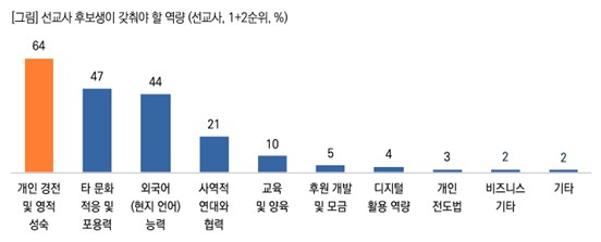 - ¼±±³ È帻ýÀÇ Çʼö ¿ª·®, ¡®Å¸ ¹®È ÀûÀÀ ¹× Æ÷¿ë·Â¡¯º¸´Ù´Â ¡®°³ÀÎ °æ°Ç/¿µÀû ¼º¼÷¡¯! ¡Ü ¼±±³»çµé¿¡°Ô ¼±±³»ç È帻ýÀÌ °®Ãç¾ß ÇÒ ¿ª·®¿¡ °üÇØ ¹°Àº °á°ú, ¡®°³ÀÎ °æ°Ç ¹× ¿µÀû ¼º¼÷¡¯(64%)À» °¡Àå Áß¿äÇÏ°Ô ÀνÄÇß´Ù. ´ÙÀ½À¸·Î ¡®Å¸¹®È ÀûÀÀ ¹× Æ÷¿ë·Â¡¯ 47%, ¡®¿Ü±¹¾î ´É·Â¡¯ 44%, ¡®»ç¿ªÀû ¿¬´ë¿Í Çù·Â¡¯ 21% µîÀÇ ¼øÀ̾ú´Ù.