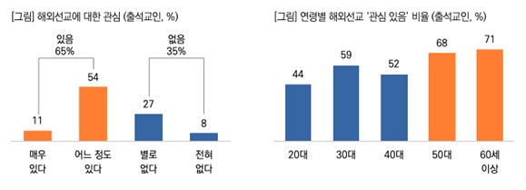 - ¼ºµµ 3¸í Áß 2¸í, ÇØ¿Ü¼±±³ ¡®°ü½É ÀÖ´Ù¡¯! ¡Ü Àü±¹ÀÇ ±³È¸ Ãâ¼® ¼ºµµ¸¦ ´ë»óÀ¸·Î ÇØ¿Ü¼±±³¿¡ ´ëÇØ °ü½Éµµ¸¦ Áú¹®ÇÑ °á°ú, ¡®°ü½É ÀÖ´Ù(¸Å¿ì+¾à°£)¡¯°í ÀÀ´äÇÑ ºñÀ²Àº 65%·Î, Ãâ¼®±³ÀÎ(¼ºµµ) 3¸í Áß 2¸íÀÌ ÇØ¿Ü¼±±³¿¡ ÀÏÁ¤ ¼öÁØÀÇ °ü½ÉÀ» º¸ÀÌ´Â °ÍÀ¸·Î ³ªÅ¸³µ´Ù. ¡Ü ´Ù¸¸ ¡®¸Å¿ì °ü½É ÀÖ´Ù¡¯ ºñÀ²Àº 11%·Î ±×ÃÄ, Àü¹ÝÀûÀÎ °ü½Éµµ¿¡ ºñÇØ ³ôÀº °ü½ÉÀ» °¡Áø ÀÀ´äÀÚ´Â Á¦ÇÑÀûÀÎ °ÍÀ¸·Î º¸ÀδÙ. ¡Ü ¿¬·Éº° ¡®50¼¼ ÀÌ»ó¡¯ Àå³ë³âÃþÀÇ °ü½Éµµ°¡ 70% ¾ÈÆÆÀ¸·Î °¡Àå ³ô¾Ò°í, ¡®20´ë¡¯´Â 44%·Î °¡Àå ³·¾Æ »ó´ëÀûÀ¸·Î Àú¿¬·ÉÃþ¿¡¼ÀÇ ÇØ¿Ü¼±±³ °ü½ÉÀÌ ³·Àº °æÇâÀ» º¸¿´´Ù.