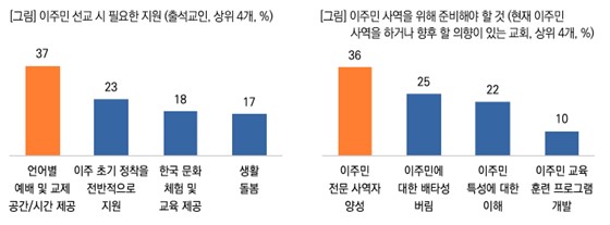 - ÀÌÁֹΠ»ç¿ª Áغñ, ¡®Àü¹® »ç¿ªÀÚ ¾ç¼º¡¯ÀÌ ÇÙ½É! ¡Ü ÀÌÁֹμ±±³ ½Ã °¡Àå ÇÊ¿äÇÑ Áö¿øÀ¸·Î ¼ºµµ´Â ¡®¾ð¾îº° ¿¹¹è ¹× ±³Á¦ °ø°£/½Ã°£ Á¦°ø¡¯(37%)À» °¡Àå ¸¹ÀÌ ²Å¾Ò´Ù. ±× ¿Ü¿¡µµ ¡®ÀÌÁÖ Ãʱâ Á¤ÂøÀ» Àü¹ÝÀûÀ¸·Î Áö¿ø¡¯ 23%, ¡®Çѱ¹ ¹®È üÇè ¹× ±³À° Á¦°ø¡¯ 18% µîÀÌ µÚ¸¦ À̾î, ¿¹¹è Á¢±Ù¼º°ú »ýȰ ¹ÐÂøÇü Áö¿øÀ» ±â´ëÇϰí ÀÖ¾ú´Ù. ¡Ü ÇÑÆí, ÇöÀç ÀÌÁֹΠ»ç¿ªÀ» Çϰųª ÇâÈÄ ÇÒ ÀÇÇâÀÌ ÀÖ´Â ¸ñȸÀÚ(´ãÀÓ¸ñ»ç)¿¡°Ô ÀÌÁֹΠ»ç¿ªÀ» À§ÇØ ÁغñÇØ¾ß ÇÒ »çÇ×À» ¹°Àº °á°ú, ¡®ÀÌÁֹΠÀü¹® »ç¿ªÀÚ ¾ç¼º¡¯ÀÌ 36%·Î °¡Àå ¸¹¾Ò°í, ÀÌ¾î ¡®ÀÌÁֹο¡ ´ëÇÑ ¹èŸ¼º ¹ö¸²¡¯ 25%, ¡®ÀÌÁֹΠƯ¼º¿¡ ´ëÇÑ ÀÌÇØ¡¯ 22% ¼øÀ̾ú´Ù. ÀÌ´Â ½ÇÁ¦ »ç¿ªÀ» À§ÇÑ ÀÎÀû ±â¹Ý ¸¶·Ã°ú ÀÎ½Ä °³¼±ÀÌ º´ÇàµÇ¾î¾ß ÇÔÀ» º¸¿©ÁØ´Ù.