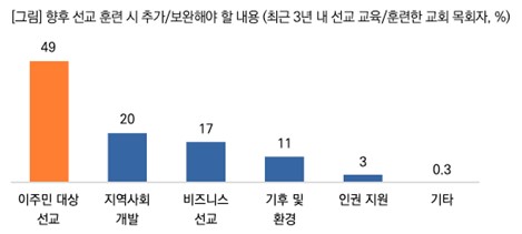 - ÇâÈÄ º¸¿ÏÀÌ ÇÊ¿äÇÑ ¼±±³ ÈÆ·Ã ³»¿ë, ¡®ÀÌÁֹΠ´ë»ó »ç¿ª¡¯! ¡Ü ÃÖ±Ù 3³â ³» ¼±±³ ±³À° ¶Ç´Â ÈÆ·ÃÀ» ½Ç½ÃÇÑ ±³È¸ ¸ñȸÀڵ鿡°Ô ÇâÈÄ º¸¿ÏÀÌ ÇÊ¿äÇÑ ÈÆ·Ã ³»¿ëÀ» ¹°Àº °á°ú, ¡®ÀÌÁֹΠ´ë»ó ¼±±³¡¯(49%)°¡ °¡Àå ¸¹ÀÌ ²ÅÇû´Ù. ¡Ü ÀÌ¾î¼ ¡®Áö¿ª»çȸ°³¹ß¡¯ 20%, ¡®ºñÁî´Ï½º¼±±³¡¯ 17%, ¡®±âÈÄ ¹× ȯ°æ¡¯ 11% ¼øÀ¸·Î ³ªÅ¸³ª, ´Ù¾çÇÑ ºÐ¾ßÀÇ ¼±±³ ¿ª·® °È°¡ ¿ä±¸µÇ°í ÀÖÀ½À» º¸¿©ÁØ´Ù. ¡Ü ƯÈ÷ ÀÌÁֹμ±±³°¡ Ÿ Ç׸ñ¿¡ ºñÇØ ¾ÐµµÀûÀ¸·Î ³ôÀº ÀÀ´ä·üÀ» ±â·ÏÇØ, ¹Ì·¡ ¼±±³ ÈÆ·ÃÀÇ ¿ì¼± °úÁ¦·Î ºÎ°¢µÇ°í ÀÖ´Ù.