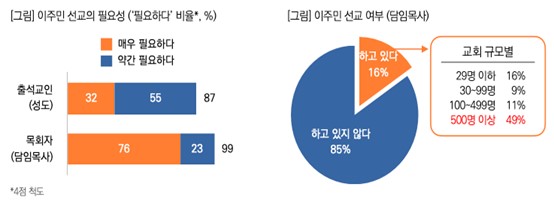 - ¸ñȸÀÚ 99%, ¡®ÀÌÁֹμ±±³ Çʿ䡯¡æ½ÇÁ¦ »ç¿ªÀº 16%¿¡ ºÒ°ú! ¡Ü Çѱ¹ ³» ÀÌÁÖ¹Î(ü·ù ¿Ü±¹ÀÎ)Àº 2024³â ±âÁØ 265¸¸ ¸íÀ¸·Î, ¿ì¸®³ª¶ó Àüü Àα¸ÀÇ 5%¸¦ ³Ñ¾î¼¹´Ù(¹ý¹«ºÎ, ÃâÀÔ±¹Åë°è). ÀÌÁ¦ ÀÌÁÖ¹ÎÀº Çѱ¹ »çȸÀÇ Áß¿äÇÑ ±¸¼º¿øÀÌ µÇ¾úÀ½À» ÀǹÌÇÑ´Ù. ¡Ü ±×·¸´Ù¸é ±³È¸´Â ÀÌÁֹμ±±³¿¡ ´ëÇØ ¾ó¸¶³ª °ø°¨Çϰí ÀÖÀ»±î? Á¶»ç °á°ú, ¼ºµµ´Â 87%, ¸ñȸÀÚ(´ãÀÓ¸ñ»ç)´Â 99%°¡ ¡®ÀÌÁֹμ±±³°¡ ÇÊ¿äÇÏ´Ù¡¯°í ÀÀ´äÇØ, µÎ ±×·ì ¸ðµÎ ÀÌÁֹμ±±³ Çʿ伺¿¡ ´ëÇÑ ³ôÀº ÀÎ½Ä ¼öÁØÀ» º¸¿´´Ù. ƯÈ÷ ¸ñȸÀÚÀÇ °æ¿ì ¡®¸Å¿ì ÇÊ¿äÇÏ´Ù¡¯°¡ 76%·Î ¼ºµµº¸´Ù ´õ¿í °ÇÏ°Ô ±× Çʿ伺À» ü°¨Çϰí ÀÖ¾ú´Ù. ¡Ü ±×·¯³ª, ½ÇÁ¦ »ç¿ªÀ¸·Î À̾îÁö´Â °æ¿ì´Â ¸¹Áö ¾Ê¾Ò´Ù. ¸ñȸÀÚ¿¡°Ô ÇöÀç ÀÌÁֹΠ»ç¿ªÀ» ÇÏ´ÂÁö ¹°¾úÀ» ¶§, ÀÌÁֹμ±±³¸¦ Çϰí ÀÖ´Â ±³È¸´Â 16%¿¡ ±×ÃÆ´Ù. ¶ÇÇÑ, ±³È¸ ±Ô¸ðº°·Î´Â ¡®500¸í ÀÌ»ó¡¯ ±³È¸(49%)¿Í 500¸í ¹Ì¸¸ Áß¼ÒÇü±³È¸(10% ³»¿Ü) °£ ÀÌÁֹμ±±³ ½Çõ ¼öÁØ¿¡ ÀÖ¾î Å« °ÝÂ÷¸¦ º¸¿´´Ù.