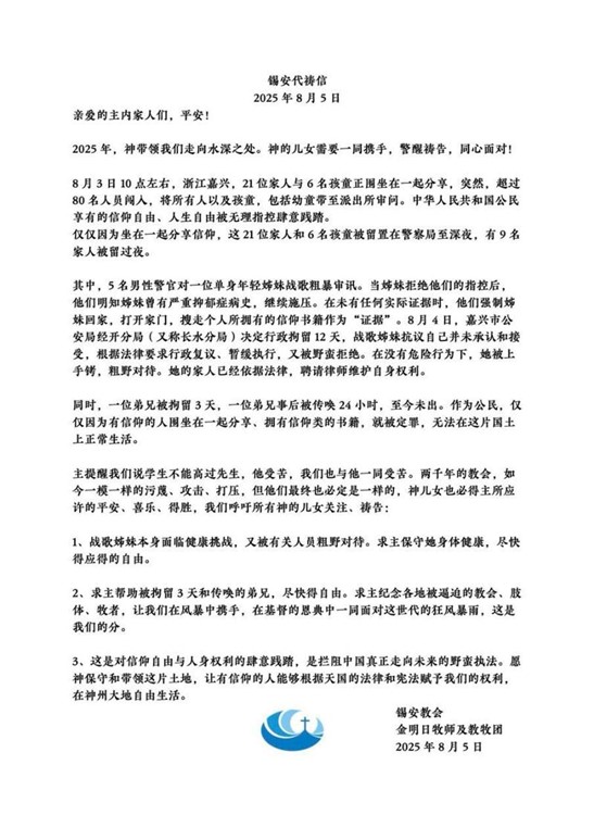 Áß±¹ ½Ã¿Â±³È¸ Áø¹Ö¸£(ÑÑÙ¥ìí) ¸ñ»ç¿Í ¸ñȸÀÚ ´ÜüµéÀº 8¿ù 5ÀÏ ¿ÀÀü Áߺ¸±âµµ ÆíÁö¸¦ ¹ßÇ¥Çß´Ù. Áö³ 8¿ù 3ÀÏ ¿ÀÀü 10½Ã°æ ÀúÀ强 ÀÚ½Ì(Ê©ýé)¿¡¼ 21¸íÀÇ ¼ºµµ¿Í 6¸íÀÇ ¾î¸°À̰¡ ÇÔ²² µÑ·¯¾É¾Æ ³ª´®°ú ±³Á¦ÀÇ ½Ã°£À» º¸³»´Âµ¥, °©ÀÚ±â 80¸íÀÌ ³Ñ´Â »ç¶÷µéÀÌ µéÀÌ´ÚÃļ ±×µéÀ» ÆÄÃâ¼Ò·Î °Á¦·Î µ¥¸®°í °¬´Ù. ±×µéÀº ¹ã´Êµµ·Ï ±¸·ùµÇ¾î ÀÖ¾ú°í, ±×Áß 9¸íÀº ±¸·ùµÈ ä ÇÏ·í¹ãÀ» º¸³Â´Ù.