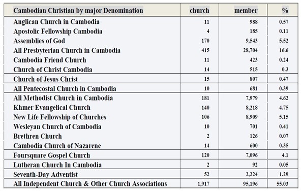 2012³â¿¡¼ 2017³â±îÁö ¼ºÀåÇϰí ÀÖ´Â ±³´ÜÀº Presbyterian Church, New Life Fellowship, Assemblies of God, Methodist Church³ª Á¤Ã¼ »óŸ¦ º¸ÀÌ´Â ±³´ÜÀº Khmer Evangelical Church, Cambodia Baptist Union, New Life Church Association, Seventh-Day Adventist, Wesleyan Church, Church of ChristÀ̸ç, ¼èÅðÇϰí ÀÖ´Â ±³´ÜÀº Foursquare Gospel, World Relief Cell Group, River of Life Church, Nazarene ChurchÀÌ´Ù. ¼ºÀåÇϰí ÀÖ´Â ±³´ÜÀº Á¶Á÷ÀûÀÎ ±³´Ü°ú ¸ñȸÀÚ ¾ç¼º °úÁ¤ÀÌ ÀÖ´Â °÷À̸ç, Á¤Ã¼ »óÅ¿¡ ÀÖ´Â ±³´ÜÀº ºñÁ¶Á÷ÀûÀÌ¸ç ¸ñȸÀÚ ¾ç¼º¼Ò°¡ ¾ø´Â °÷ÀÌ´Ù. ¼èÅðÇϰí ÀÖ´Â °÷Àº ±¸Á¦ Áß½ÉÀÇ »ç¿ªÀ» ÇØ ¿Â °÷À¸·Î º¸ÀδÙ.