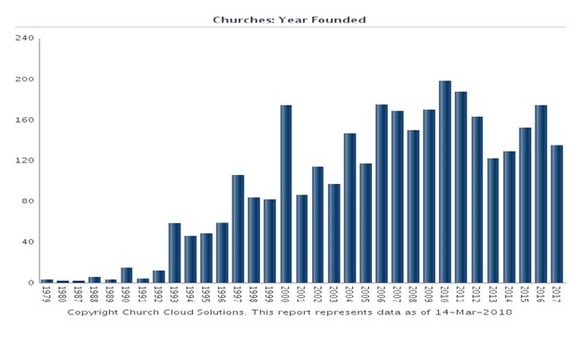 2012-2017³â »çÀÌ¿¡ ±³È¸ ¼ýÀÚ´Â 635°³°¡ »õ·Î »ý°å°í 608°³°¡ ¹®À» ´Ý¾Ò´Ù. ¸»ÇÏÀÚ¸é ¸Å´Þ 11°³ÀÇ ±³È¸°¡ »õ·Î °³Ã´µÇ¾úÁö¸¸ ¸Å´Þ 10°³ÀÇ ±³È¸°¡ Á¤¸®µÈ ¼ÀÀ̾ú´Ù. ±×¸®°í ÀüüÀûÀ¸·Î ÀÌ ±â°£¿¡ ±³ÀÎÀº 4,000¿© ¸íÀÌ ÁÙ¾ú´Ù. ±³È¸´ç Æò±Õ ÀοøÀÌ 2012³â 65¸í¿¡¼ 2017³â¿¡ 56¸íÀ¸·Î ÁÙ¾ú´Ù. 2008³âºÎÅÍ 2012³â±îÁö ±³È¸ ¼ºÀå·üÀº Æò±Õ 8.18%¿´À¸³ª, 2013-2017³â »çÀÌ ±³È¸ ¼ºÀå·üÀº Æò±Õ 4.67%¿´´Ù. ±³È¸ ¼ýÀÚ´Â Áõ°¡ÇßÁö¸¸, ±³È¸ÀÇ Áõ°¡¼¼°¡ °¨¼ÒÇß´Ù. 2017³â ÇöÀç Àüü ±³È¸¿¡¼ ¾î¸°ÀÌ Æ÷ÇÔ ±³ÀÎ ¼ö°¡ 50¸íÀÌ ¾È µÇ´Â °÷Àº 32%, 60-100¸íÀº 23%, 110-200¸íÀº 29%, 210-1000¸í 14%, 1,000¸í ÀÌ»óÀÌ 3%ÀÌ´Ù.