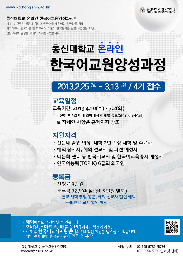 ÃѽŴëÇб³´Â ¿Ü±¹¾î·Î¼ Çѱ¹¾î¸¦ ¼¼°è¿¡ º¸±ÞÇÒ »ç¸í°¨ ÀÖ´Â Çѱ¹¾îÀü¹®±³»ç¸¦ ¾ç¼ºÇÕ´Ï´Ù. Çѱ¹¾î¸¦ ¹è¿ì·Á´Â ¿Ü±¹ÀÎÀ̳ª ÇØ¿Üµ¿Æ÷ ¹× ÀÌÁÖ¹Î, ±âŸ ´Ù¹®È¼¾ÅÍ, ÇØ¿ÜÇѱÛÇб³ µî ¿©·¯ ±â°ü¿¡¼ Çѱ¹¾î¸¦ ÁöµµÇÒ ¸¹Àº ºÐµéÀÇ Àû±ØÀûÀÎ °ü½É°ú Áö¿øÀ» ¹Ù¶ø´Ï´Ù.