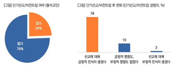 - ´Ü±â¼±±³ °æÇèÀÚ 78%, ¡®¼±±³¿¡ ±àÁ¤Àû ÀÎ½Ä »ý°Ü¡¯! ¡Ü ´Ü±â¼±±³/ºñÀüÆ®¸³ °æÇè¿¡ ´ëÇØ¼´Â ¡®¾ø´Ù¡¯ 76%, ¡®ÀÖ´Ù¡¯ 24%·Î ¼ºµµ 4¸í Áß 1¸íÀº ´Ü±â¼±±³¸¦ ´Ù³à¿Â ÀûÀÌ ÀÖ´Â °ÍÀ¸·Î ³ªÅ¸³µ´Ù. ¡Ü ´Ü±â¼±±³ Âü¿©ÀÚ¿¡°Ô ´Ü±â¼±±³ ÀÌÈÄ ¼±±³¿¡ ´ëÇÑ ÀÎ½Ä º¯È¸¦ ¹°Àº °á°ú, ¡®±àÁ¤Àû ÀνÄÀÌ »ý°å´Ù¡¯°í ÀÀ´äÇÑ ºñÀ²ÀÌ ¹«·Á 78%¿´°í, ¡®ºÎÁ¤Àû ÀνÄÀÌ »ý°å´Ù¡¯´Â 3%¿¡ ºÒ°úÇß´Ù. ¡Ü ÀÌ´Â ´Ü±â¼±±³ °æÇèÀÌ ¼±±³¿¡ ´ëÇÑ Åµµ¿Í ÀνÄÀ» º¯È½ÃŰ´Â µ¥ ÀÖ¾î Áß¿äÇÑ °è±â°¡ µÉ ¼ö ÀÖ À½À» º¸¿©ÁÖ´Â °á°ú·Î, ÁßÀå±âÀû ¼±±³ »ç¿ª¿¡µµ ±àÁ¤Àû ½Ã³ÊÁö¸¦ ±â´ëÇÒ ¼ö ÀÖÀ½À» ½Ã»çÇÑ´Ù.